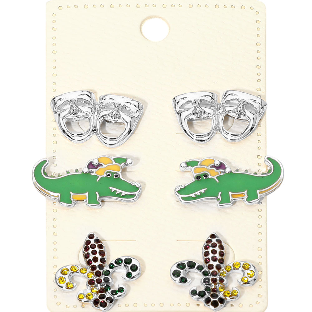 3Pairs - Mardi Gras Mask Crocodile Fleur de Lis Stud Earring Set 3Pairs - Mardi Gras Mask Crocodile Fleur de Lis Stud Earring Set