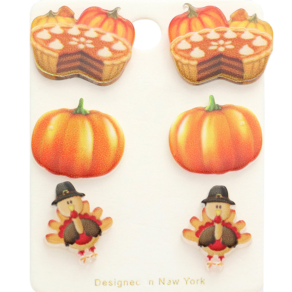 Details • Size : 0.6" L • Post Back • Celebrate Thanksgiving with this festive 3-pair stud earring set featuring pumpkin pie, pumpkins, and a cheerful turkey design. A fun and lightweight accessory perfect for holiday gatherings or seasonal outfits. • Lead and Nickel Compliant