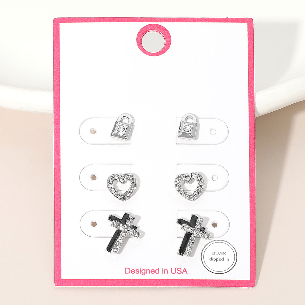 Details • Size : 0.3" - 0.5" L • Post Back • Stud earring set featuring lock, heart, and cross designs for versatile everyday wear. A coordinated multi pair set ideal for gifting, faith inspired styling, and boutique displays. Perfect for mixing and matching, stacking looks, or wearing individually for meaningful and trend focused accessory styling. • Lead and Nickel Compliant • Sterling Silver Dipped