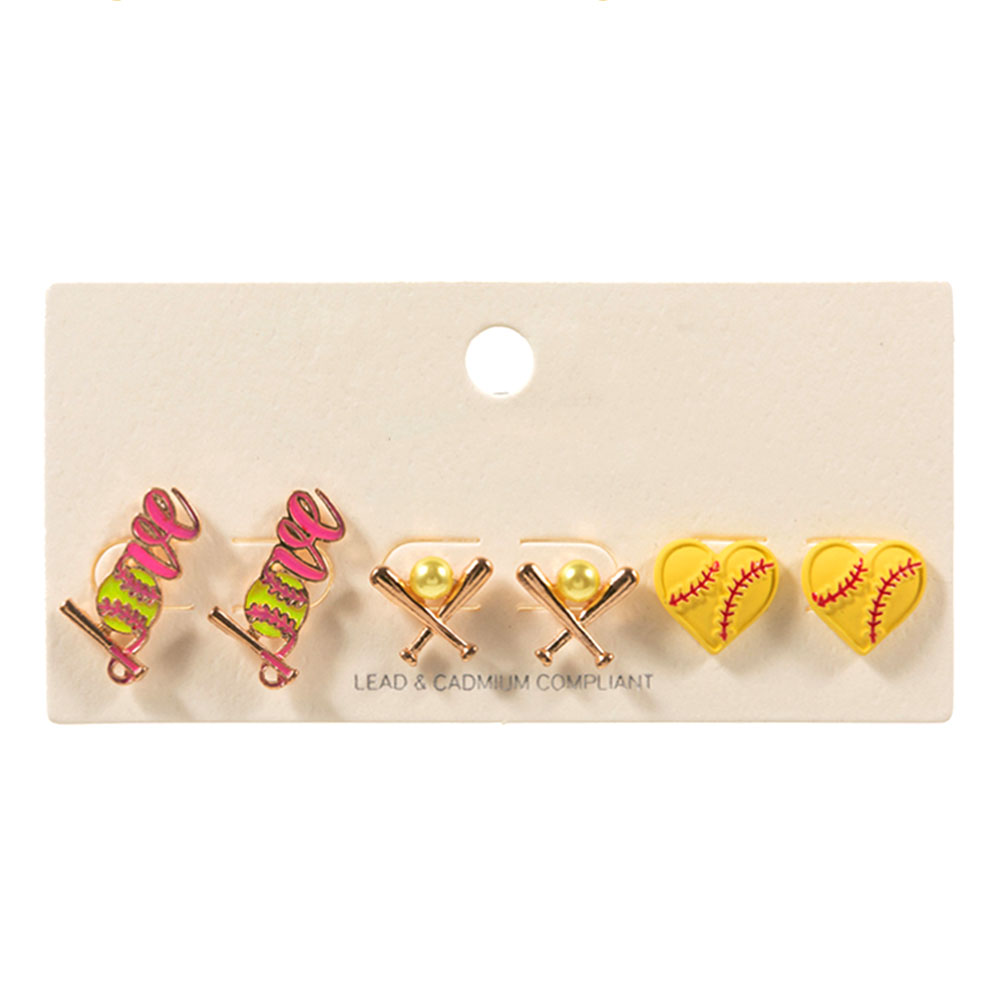 Details • Size : 0.4" L • Titanium Post Back • Sporty stud earring set featuring playful softball-inspired designs including hearts, bats, and script accents for easy mix-and-match styling. Lightweight and comfortable, these studs are perfect for game day outfits, team events, casual wear, and gifting, making them a fun addition to boutique accessory collections. • Lead and Nickel Compliant • Hypoallergenic