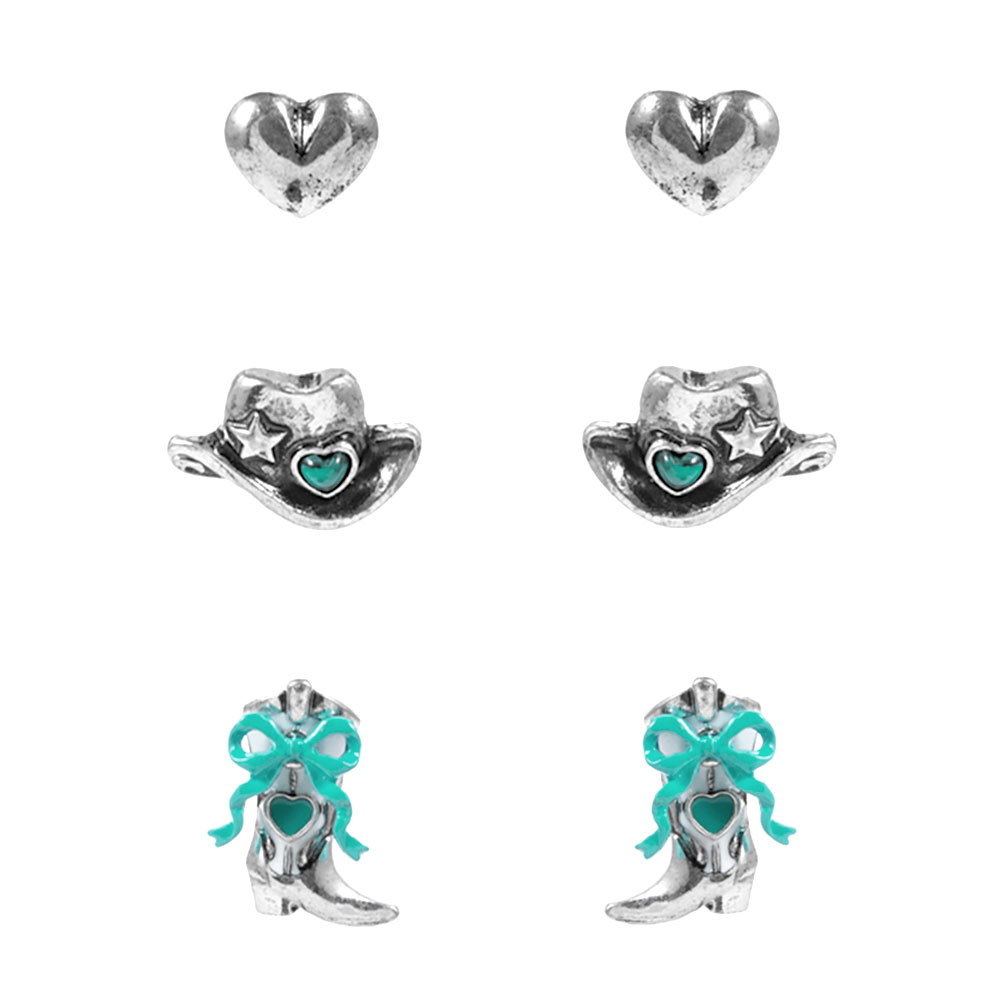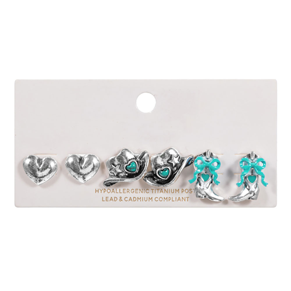 Details • Size : 0.5" - 0.7" L • Titanium Post Back • Three-pair western-inspired stud earring assortment featuring heart, hat, and boot motifs for mix-and-match charm. Designed for effortless everyday styling, gifting, and travel-ready versatility, this coordinated trio delivers playful, statement-worthy looks in one compact, easy-to-style jewelry set. • Hypoallergenic • Lead and Nickel Compliant