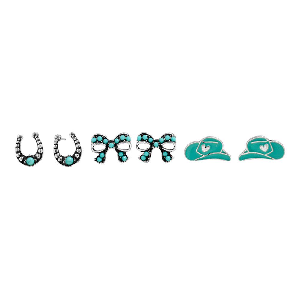 Details • Size : 0.5" - 0.7" L • Titanium Post Back • Three-piece western-inspired stud earring set featuring classic motifs for easy mix-and-match styling. Perfect for everyday wear, festivals, and gift giving, offering versatile looks from subtle accents to standout statement combinations in one convenient coordinated collection. • Hypoallergenic • Lead and Nickel Compliant