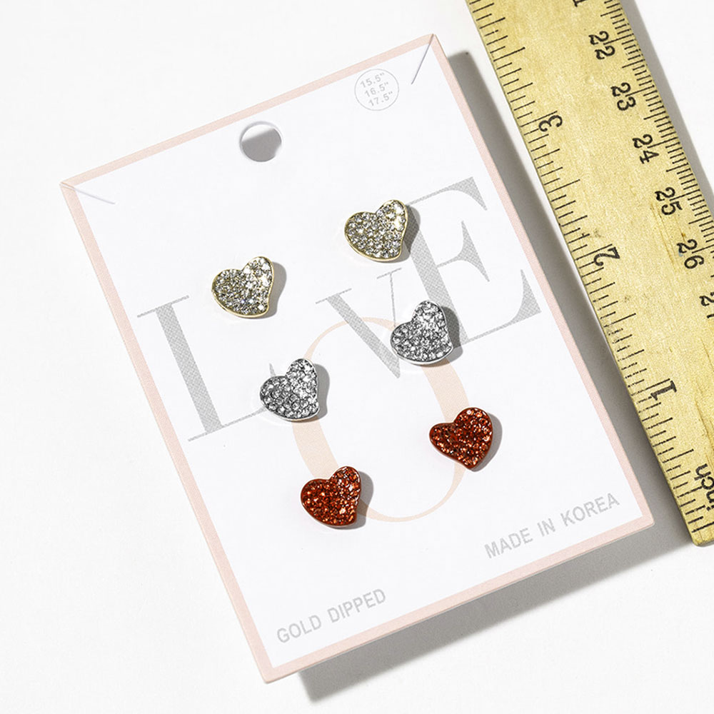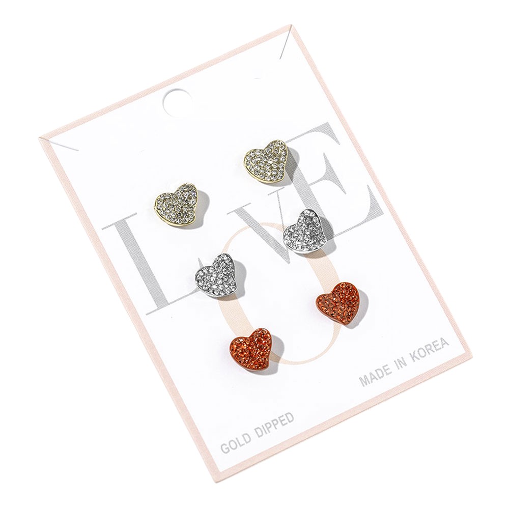3Pairs - White Gold Dipped Rhinestone Pave Heart Stud Earring Set