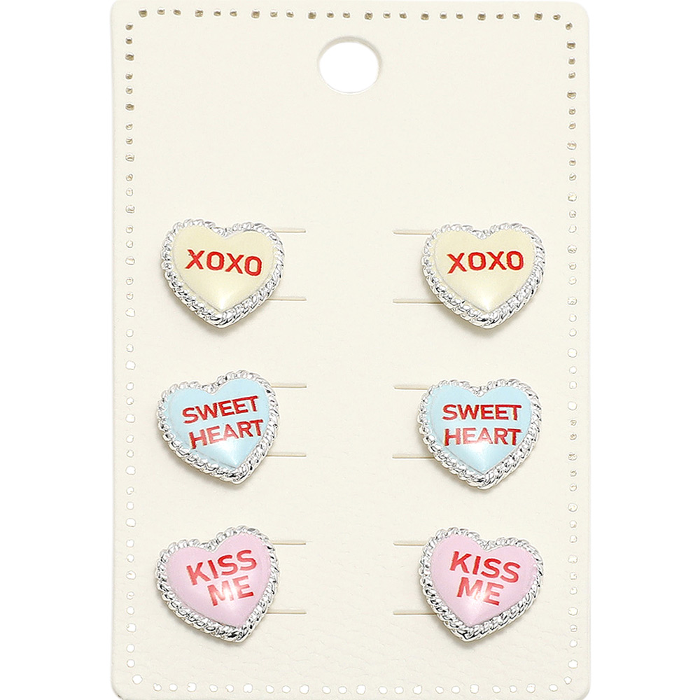 3Pairs - XOXO SWEET HEART KISS ME Message Heart Stud Earring Set