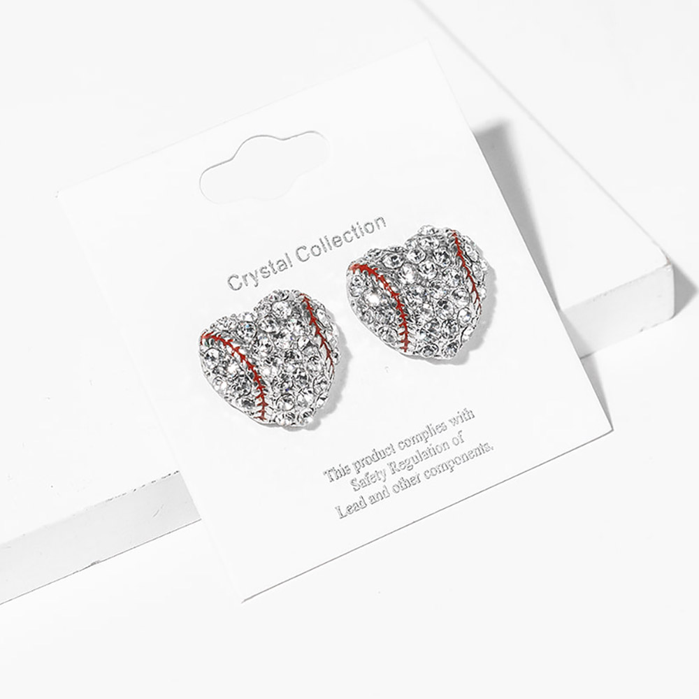 Details • Size : 0.7" X 0.8" • Post Back • Playful heart-shaped stud earrings inspired by classic baseball details, featuring a sparkling crystal-covered surface for eye-catching shine. A fun statement accessory perfect for sports fans, game day outfits, themed collections, and novelty jewelry displays with a bold, fashionable twist. • Lead and Nickel Compliant