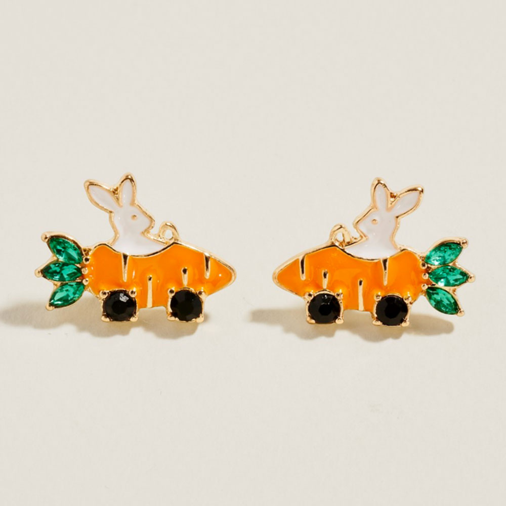 Details • Size : 0.8" X 0.6" • Titanium Post Back • Playful bunny and carrot stud earrings featuring a charming animal motif with sparkling accents. Ideal for Easter collections, spring gift shops, novelty jewelry displays, and seasonal promotions. A fun, lightweight design that adds a cheerful touch to everyday and holiday looks. • Hypoallergenic • Lead and Nickel Compliant