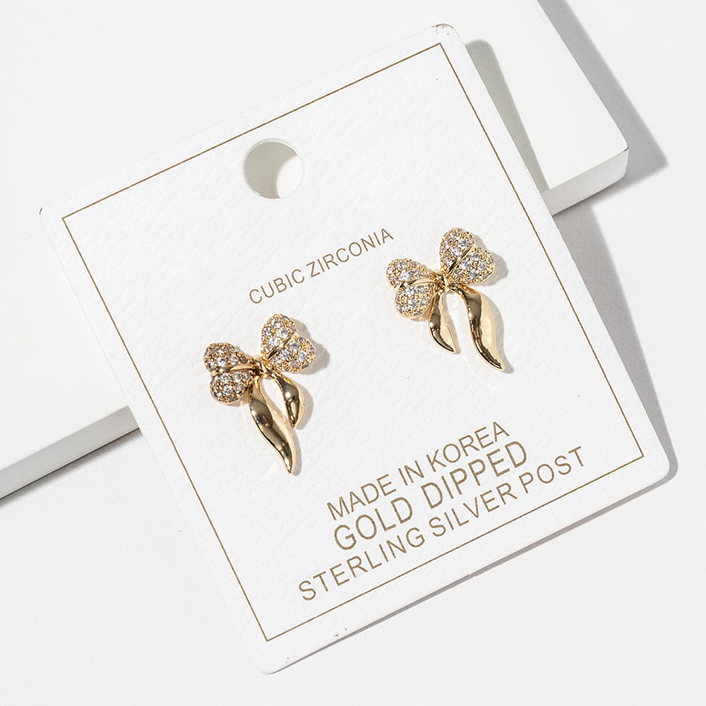 Details • Size : 0.5" X 0.75" • Delicate bow accent stud earrings featuring sparkling cubic zirconia details and a graceful drop silhouette. Designed to add a touch of charm and elegance to everyday looks or special occasions, these studs pair beautifully with casual outfits, dresses, and layered ear styling for a polished finish. • CZ Cubic Zirconia • Gold Dipped • Lead and Nickel Compliant • Made In Korea • Sterling Silver Post