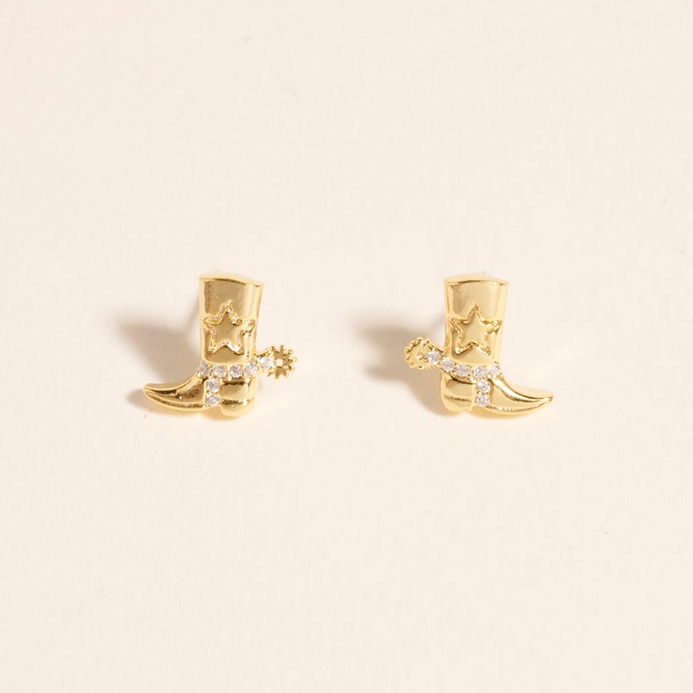 Details • Size : 0.4" X 0.4" • Post Back • Cowboy boot stud earrings inspired by western style and happy trails themes. These playful studs add a rustic accent to everyday outfits, rodeo looks, festivals, and gift assortments. Ideal for western boutiques, novelty jewelry collections, and customers who love country-inspired accessories. • Gold Dipped • Hypoallergenic • Made In Korea