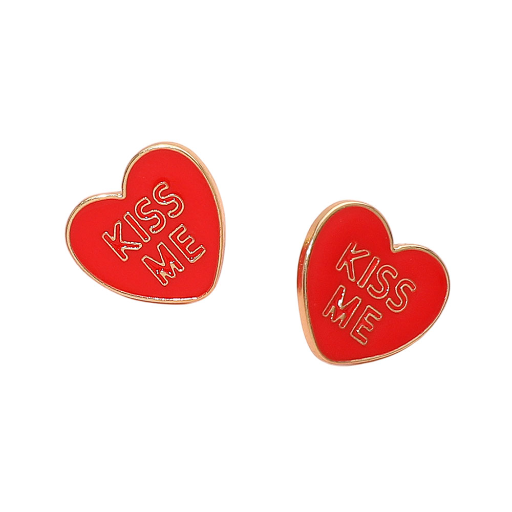 Details • Size : 0.6" X 0.6" • Post Back • Playful heart stud earrings featuring a bold “Kiss Me” motif in a clean, modern silhouette designed to stand out without overpowering your look. Ideal for everyday wear or flirty nights out, these lightweight studs add charm, personality, and a fun romantic accent to casual outfits or dressier styles. • Lead and Nickel Compliant