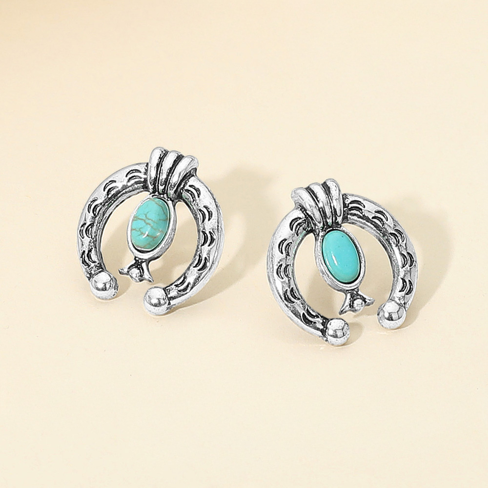 Details • Size : 0.7" X 0.75" • Post Back • Bring a touch of Western charm to your style with these horseshoe stud earrings featuring a turquoise accent. Their detailed design and rustic finish make them a standout accessory for casual or boho looks. Perfect for gifting or adding a subtle Southwestern flair to any outfit. • Lead and Nickel Compliant