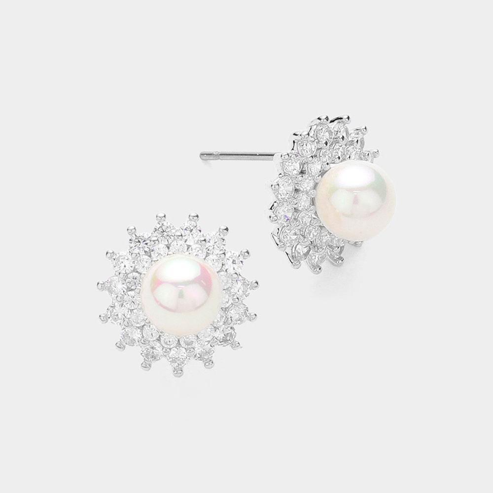 Pearl Accented CZ Stone Paved Spike Stud Earrings