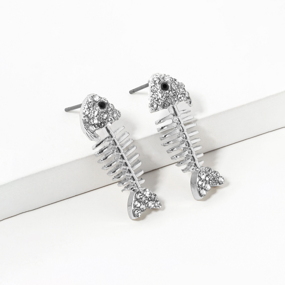 • Unique fishbone drop earrings accented with shimmering details for a playful yet edgy look. Perfect for adding personality to casual outfits, themed events or standout fashion moments. A fun statement accessory with bold, eye-catching charm.