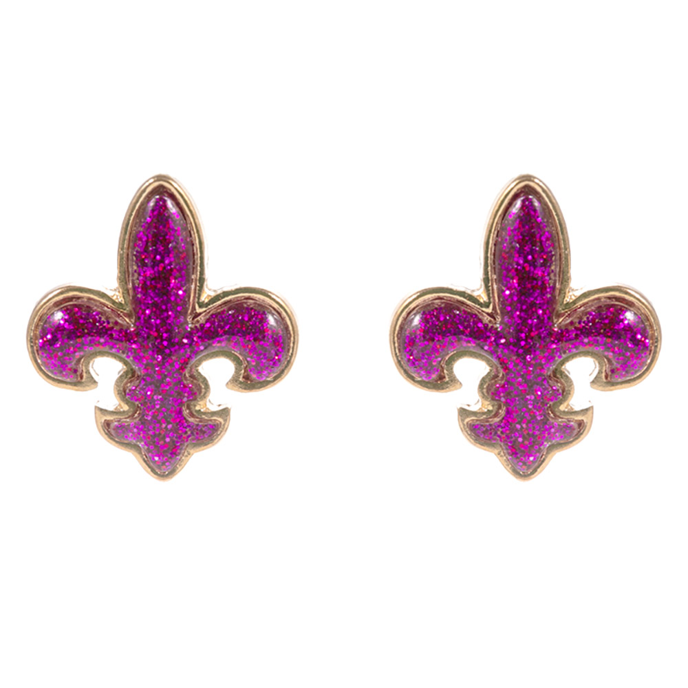 Details • Size : 0.7" X 0.75" • Titanium Post Back • Stylish fleur-de-lis stud earrings featuring a shimmering glitter accent for a festive and bold look. Perfect for celebrations, themed events, or everyday sparkle, these earrings bring charm and personality to any outfit, offering a unique touch of vibrant and elegant style. • Hypoallergenic • Lead and Nickel Compliant