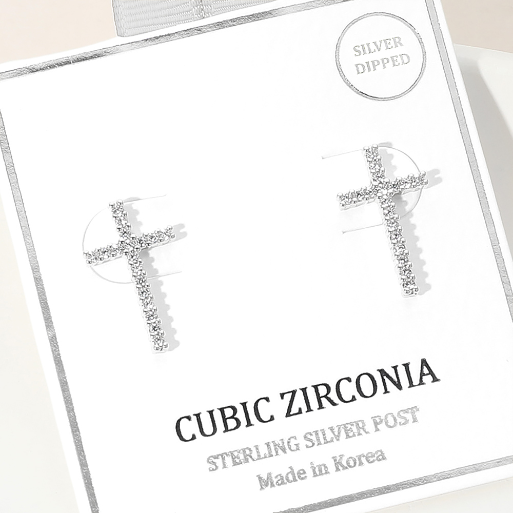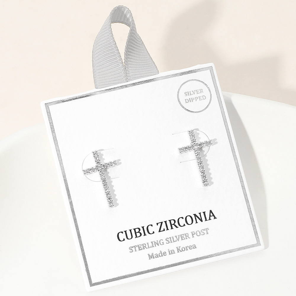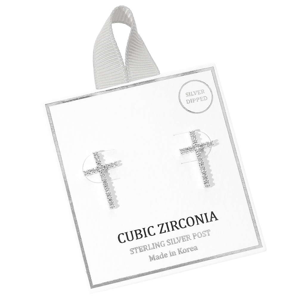 Details • Size : 0.5" X 0.75" • Beautiful cross drop earrings featuring shimmering cubic zirconia accents and a refined minimalist shape. Designed with a secure sterling post and timeless style, perfect for daily wear or gifting. A radiant accessory that adds subtle sparkle to any look. • Sterling Silver Dipped • CZ Cubic Zirconia • Lead and Nickel Compliant • Made In Korea • Sterling Silver Post