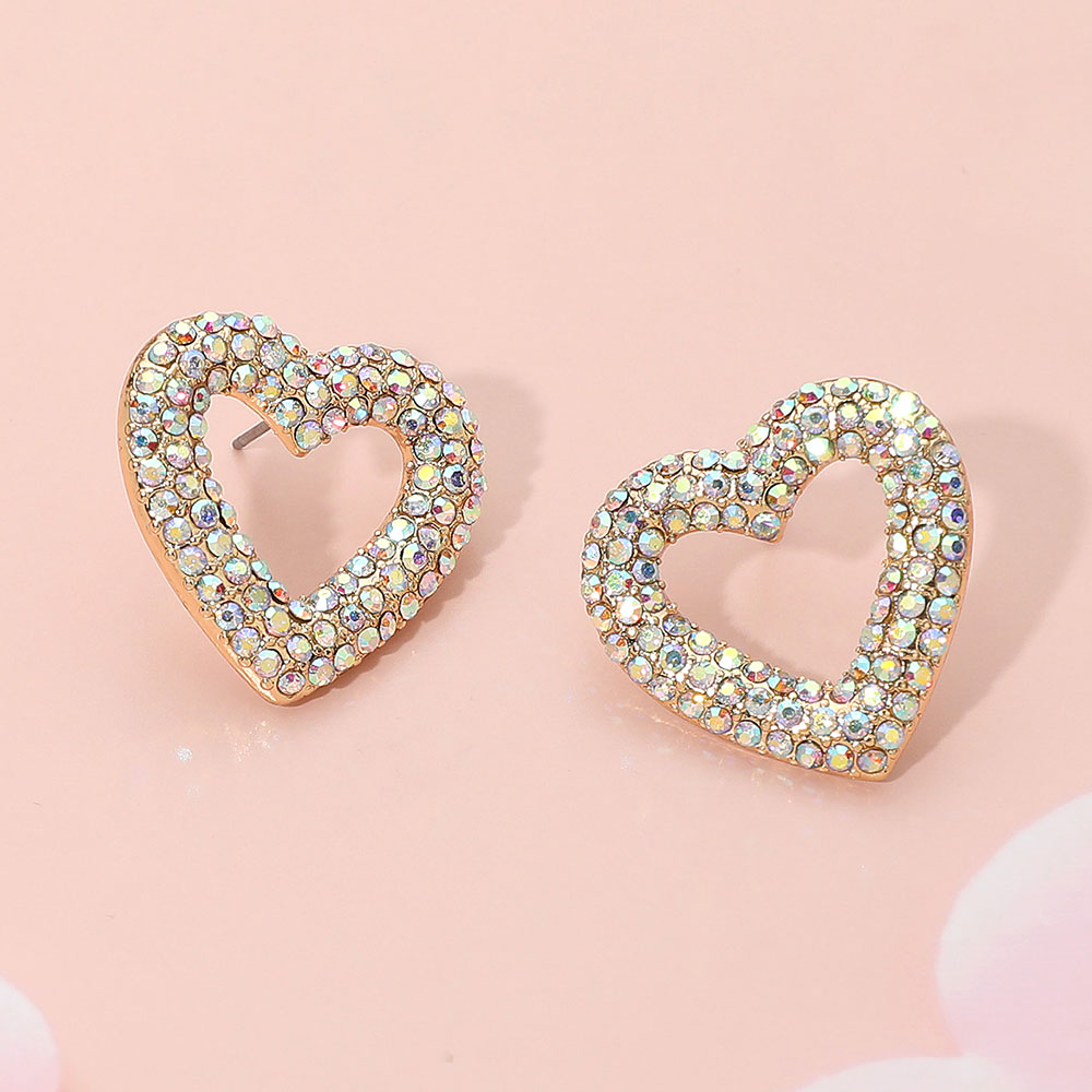 • Make a statement of love and style with these sparkling heart stud earrings. Adorned with shimmering stones in an open-heart design, they catch the light beautifully and add a touch of glamour to any look, from casual chic to special occasion elegance.