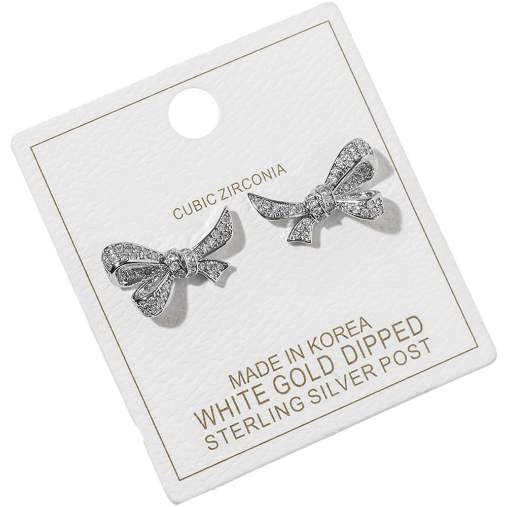 White Gold Dipped CZ Pave Bow Knot Stud Earrings