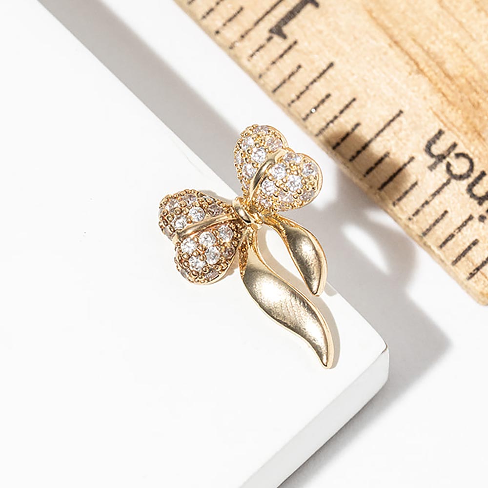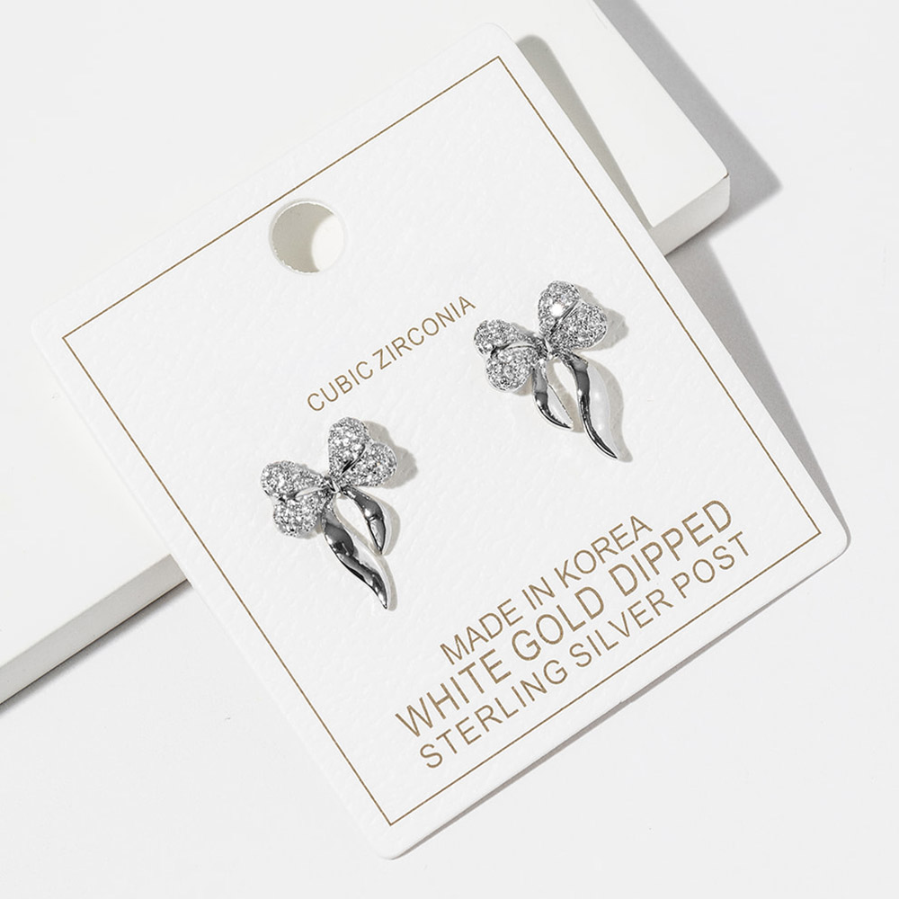 Details • Size : 0.5" X 0.75" • Delicate bow accent stud earrings featuring sparkling cubic zirconia details and a graceful drop silhouette. Designed to add a touch of charm and elegance to everyday looks or special occasions, these studs pair beautifully with casual outfits, dresses, and layered ear styling for a polished finish. • CZ Cubic Zirconia • Gold Dipped • Lead and Nickel Compliant • Made In Korea • Sterling Silver Post