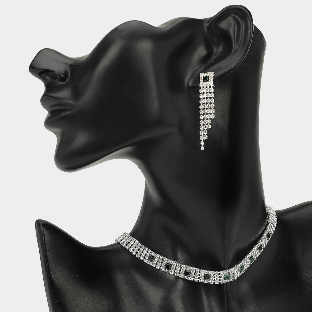 • Turn heads with this rhinestone choker and earring set featuring shimmering strands and square accent stones. Designed for elegant evenings, parties, or special occasions, this coordinated set delivers striking sparkle and a refined touch to any glamorous ensemble.