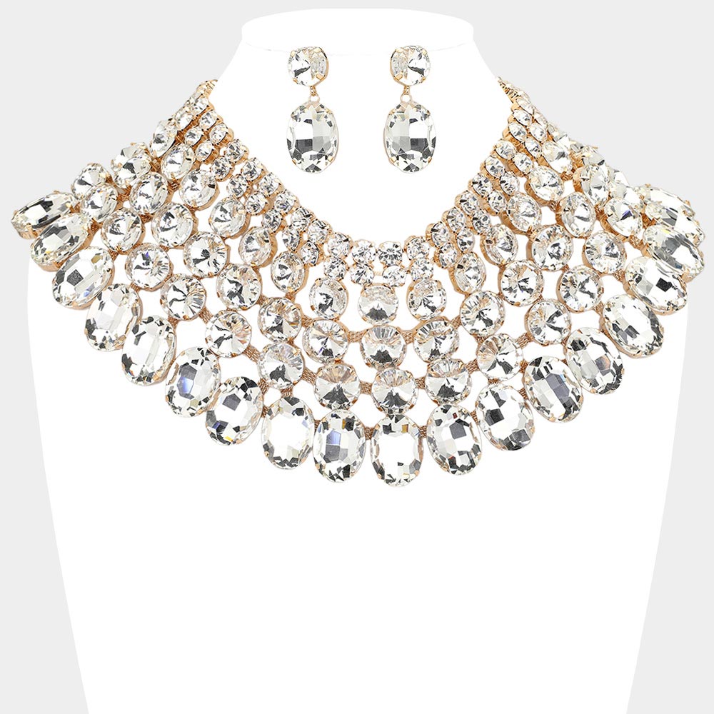 • Dramatic bib necklace and earring set featuring layered oval stones arranged in a bold cascading design. Perfect for weddings, galas, performances or any occasion that calls for standout glamour. An eye-catching accessory set that elevates formal and evening looks.