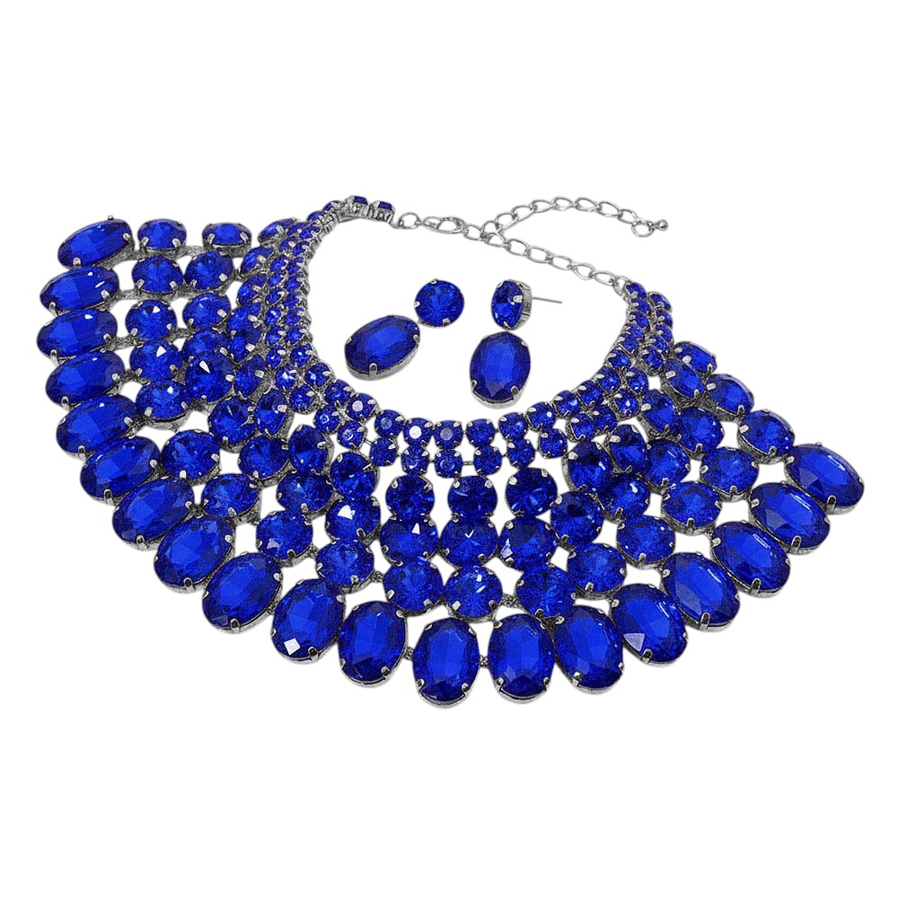 • Dramatic bib necklace and earring set featuring layered oval stones arranged in a bold cascading design. Perfect for weddings, galas, performances or any occasion that calls for standout glamour. An eye-catching accessory set that elevates formal and evening looks.