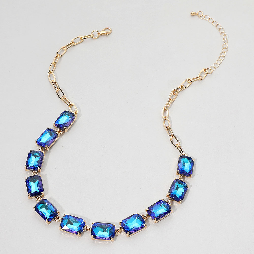 Details • Necklace Size : 16" + 2.5" L • Decor Size : 0.4" L • This elegant gemstone chain necklace features a row of precisely cut stones linked with a sleek chain for a refined, modern look. Its adjustable closure ensures a comfortable fit, making it a sophisticated accessory for formal occasions, evening wear, or adding a statement touch to everyday style. • Lead and Nickel Compliant