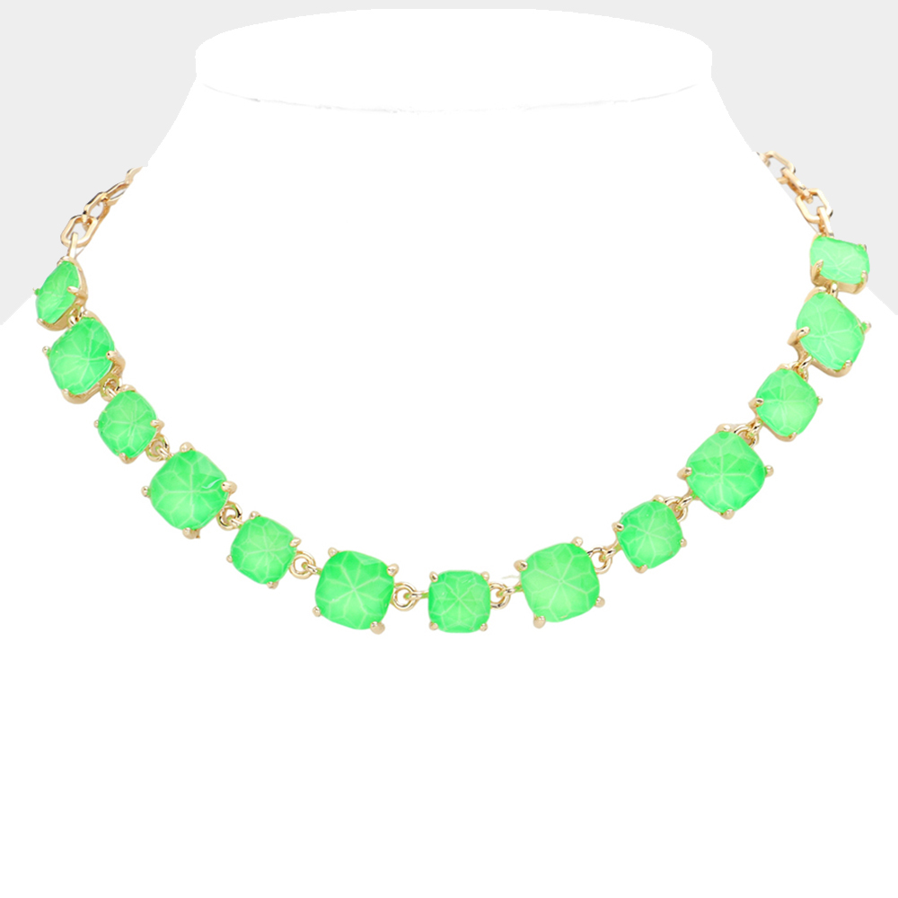 Details • Necklace Size : 16" + 2.75" L • Decor Size : 0.5" L • Elevate your style with this stunning square cut gemstone statement necklace. Featuring shimmering faceted stones linked in a classic design, it offers a chic adjustable fit. Perfect for evening wear, weddings, parties, or adding a sophisticated sparkle to your everyday look. • Lead and Nickel Compliant