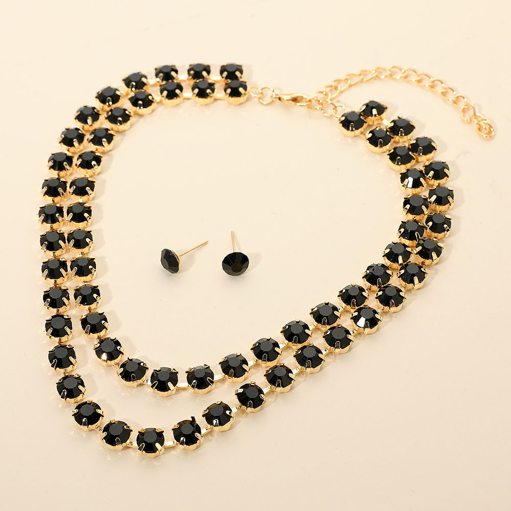 Details • Necklace Size : 13.5" + 3"L • Decor Size : 1" L • Earrings Size : 0.3" L • This double row rhinestone necklace and matching stud earring set adds radiant sparkle to any outfit. Designed to enhance both casual and formal looks, it delivers timeless elegance and refined glamour—perfect for evening events, special occasions, or adding shine to everyday wear. • Lead and Nickel Compliant