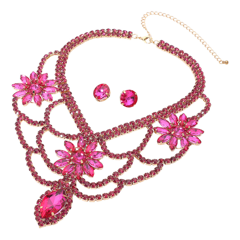 Details • Necklace Size : 16" + 7" L • Decor Size : 4.5" L • Earring Size : 0.6" L • Glamorous statement bib necklace and earring set featuring bold floral crystal clusters and cascading layered detailing. Designed to elevate evening looks, special events, and formal occasions with eye-catching sparkle and dramatic elegance perfect for standout styling.