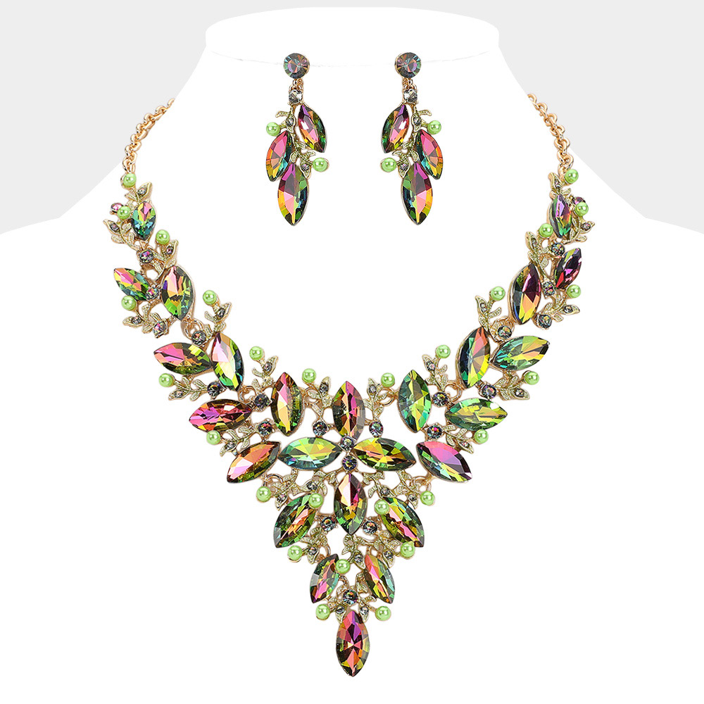 Marquise Glass Stone Cluster Pearl Embellished Vine Evening Necklace