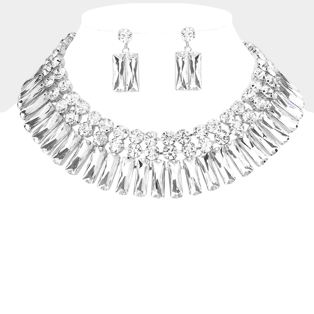Details • Necklace Size : 16" + 4.5" L • Decor Size : 1.5" L • Earring Size : 1.5" L • Shine from every angle with this iridescent rhinestone statement necklace and matching earrings. Featuring radiant rectangular crystals paired with shimmering round stones, this bold set reflects rainbow hues for a dazzling finish. Perfect for stage, pageants, parties, and special occasions, this design instantly elevates any evening or event look. Lightweight yet striking, it’s a go-to accessory for making a glamorous entrance.