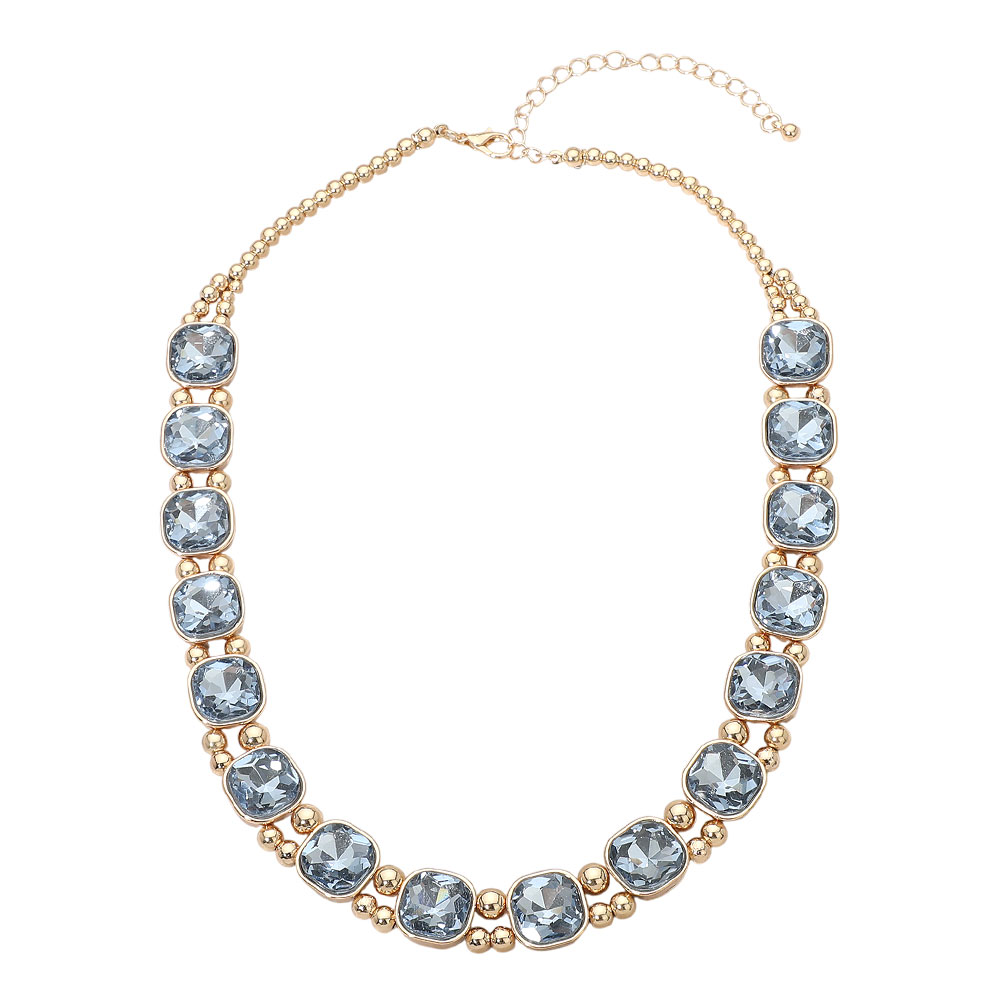 • Elegant linked necklace featuring evenly spaced square-cut stones framed by polished metal accents. Designed with an adjustable chain for versatile styling, this piece adds refined sparkle to everyday looks, special occasions, and layered jewelry collections, making it a timeless addition for retail displays and gifting.
