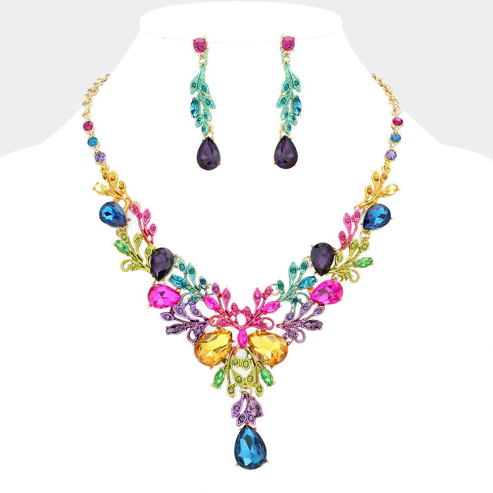 Teardrop Round Stone Accented Leaf Cluster Evening Necklace