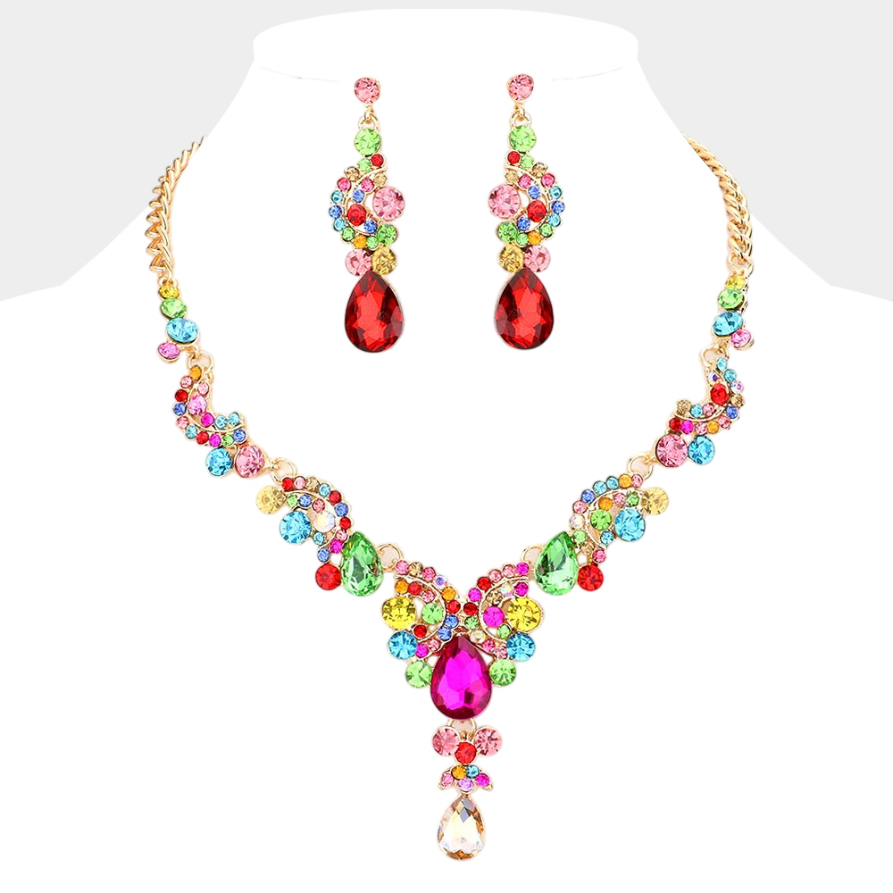 • Stunning teardrop crystal necklace and earring set designed with intricate clustered detailing and sparkling stones. Features a graceful V-shaped centerpiece and matching drop earrings, perfect for formal events, weddings, parties, and special occasions. A glamorous statement set that elevates any outfit.
