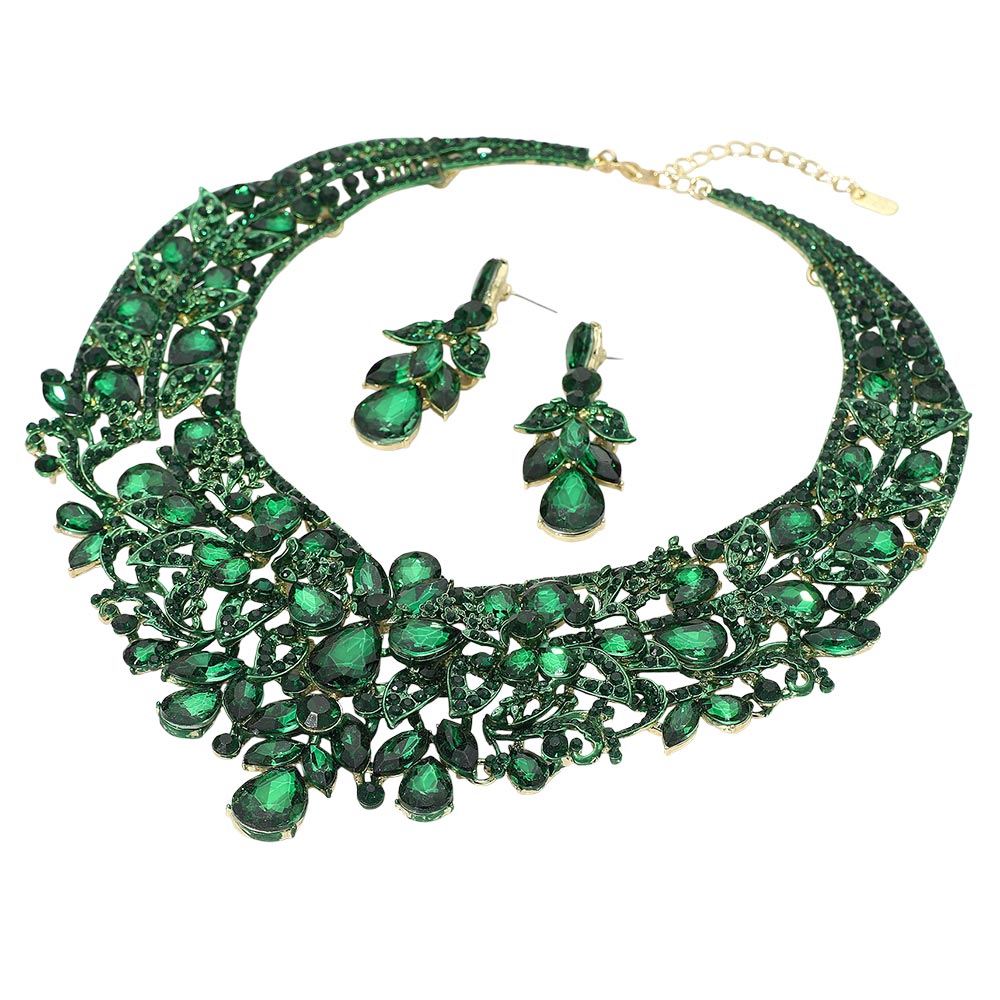 • Turn heads with this elegant emerald-inspired necklace and earring set, featuring intricate gemstone detailing and a regal design. Perfect for galas, evening events, or formal occasions, this striking jewelry duo adds a touch of timeless sophistication and bold glamour.