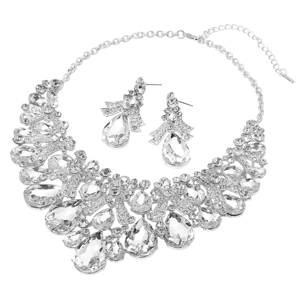 • Make an unforgettable impression with this statement teardrop bib necklace and earring set. Adorned with an array of dazzling stones and intricate detailing, this bold jewelry set adds luxurious sparkle and sophistication—perfect for weddings, galas, and evening events.