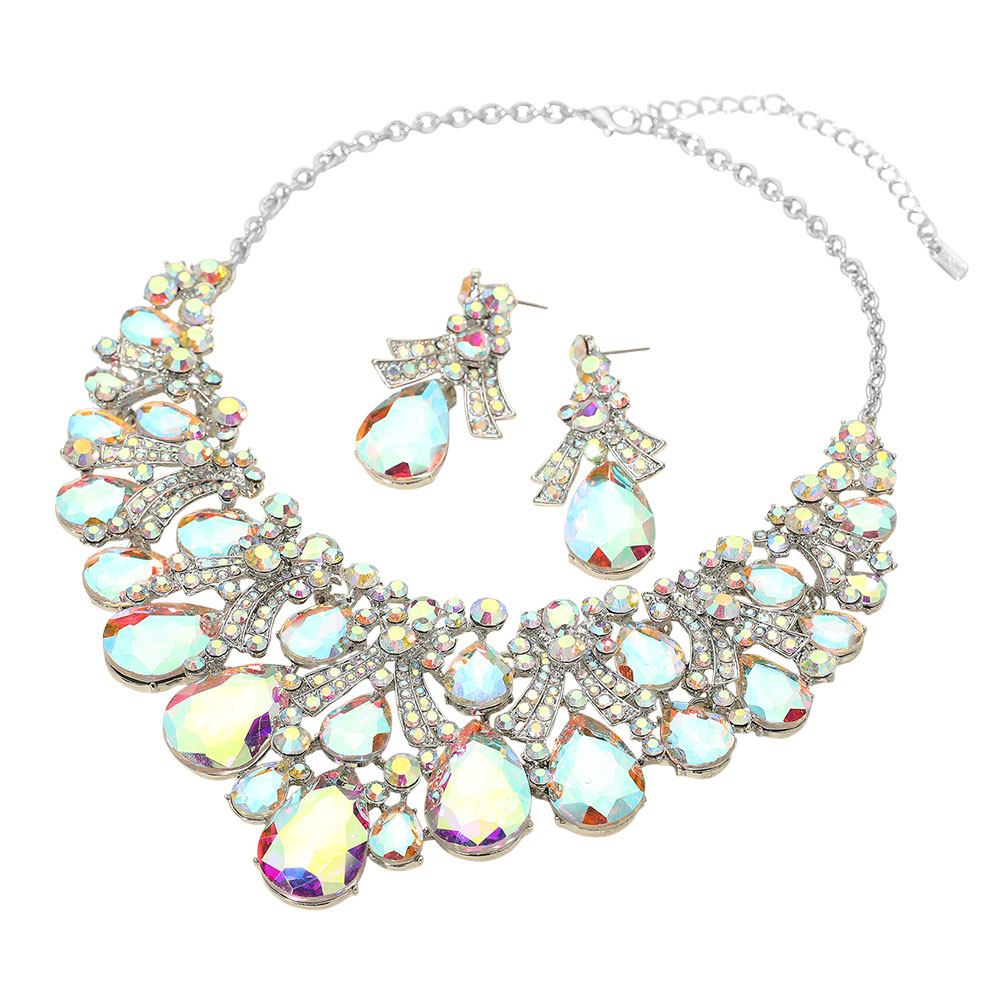 • Make an unforgettable impression with this statement teardrop bib necklace and earring set. Adorned with an array of dazzling stones and intricate detailing, this bold jewelry set adds luxurious sparkle and sophistication—perfect for weddings, galas, and evening events.