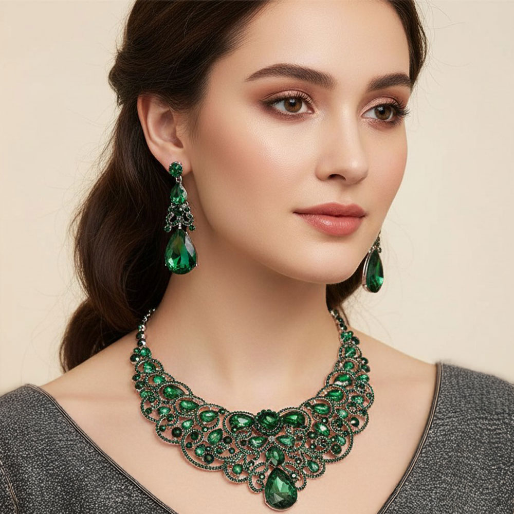 • Shine effortlessly with this glamorous iridescent necklace and earring set, designed with shimmering teardrop accents and intricate crystal detailing. Perfect for weddings, galas, or evening events, it adds a radiant touch of luxury and brilliance to any special occasion look.