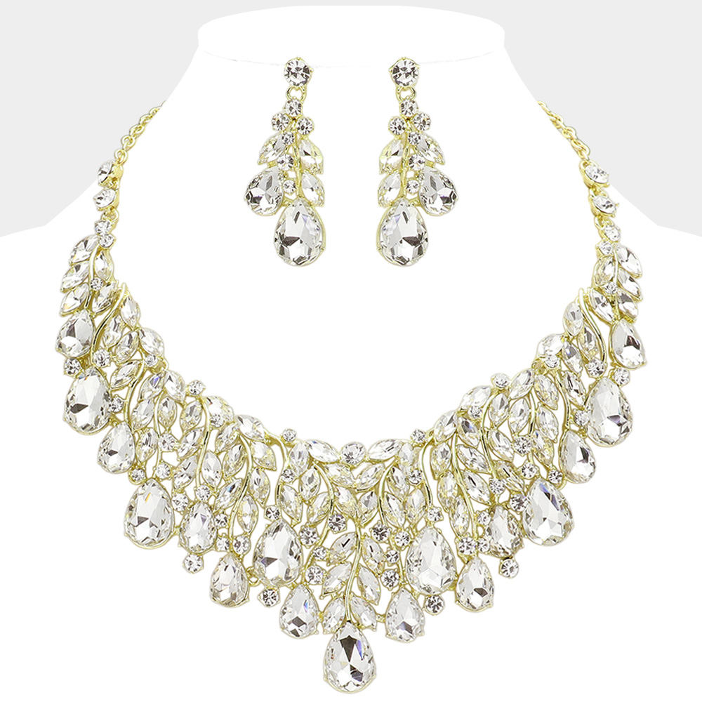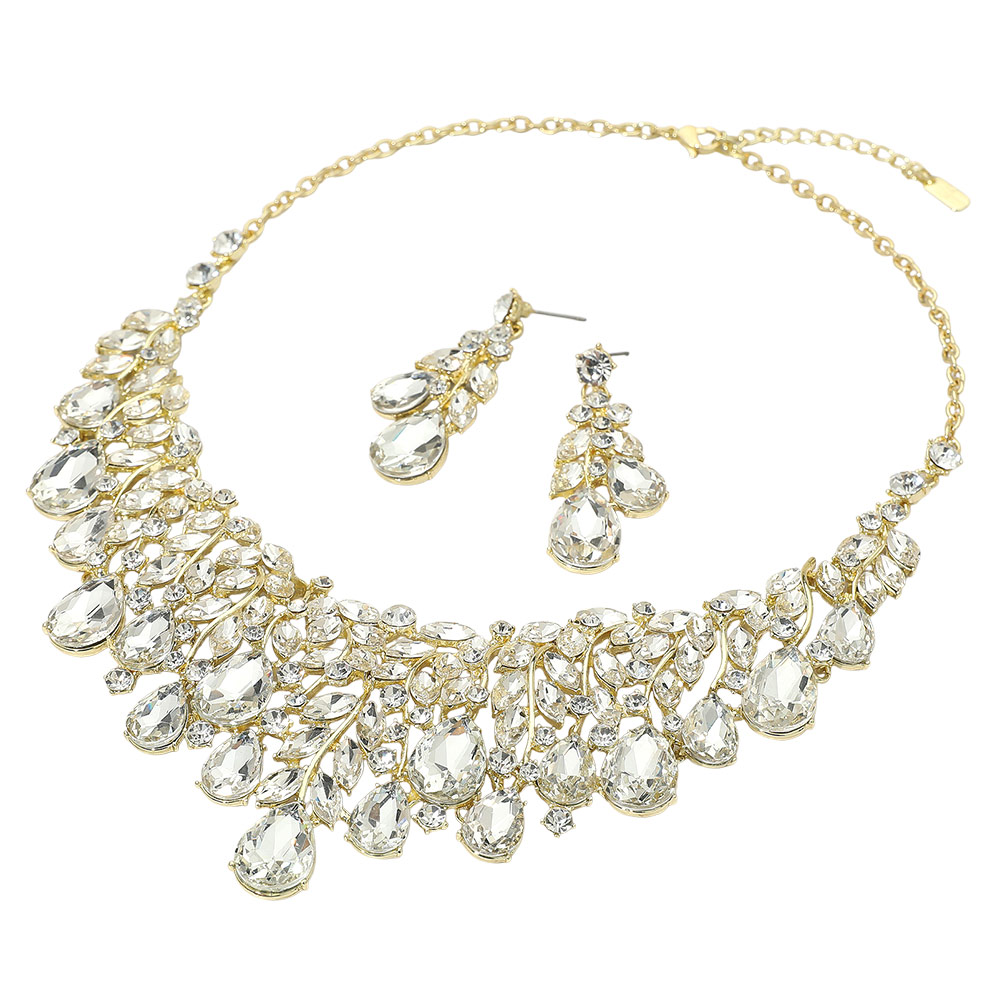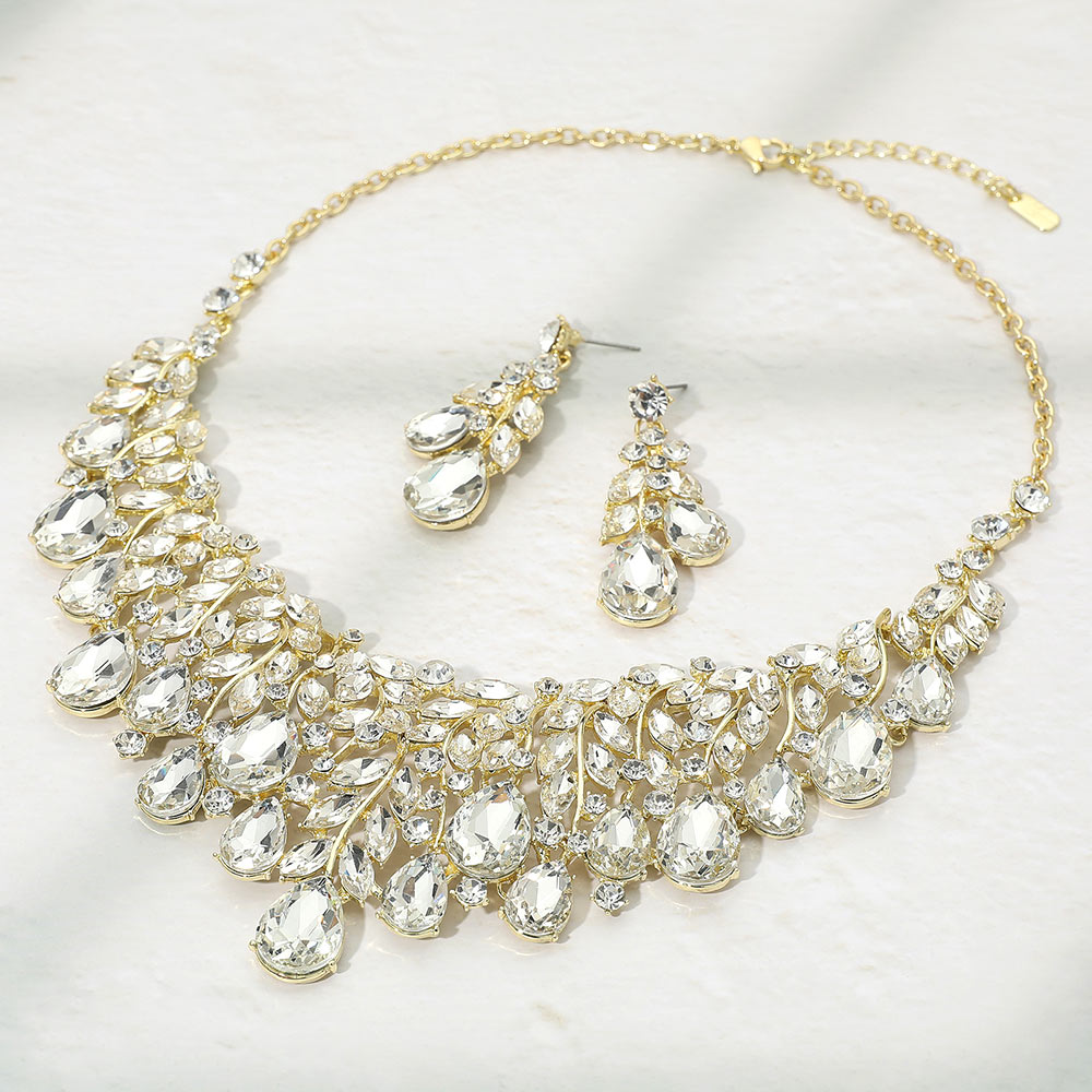 • Exquisite statement necklace and matching earrings featuring a stunning teardrop gem cluster design. Perfect for formal occasions, weddings, or evening events, this jewelry set adds instant glamour and sophistication to any outfit with its luxurious sparkle and refined detailing.