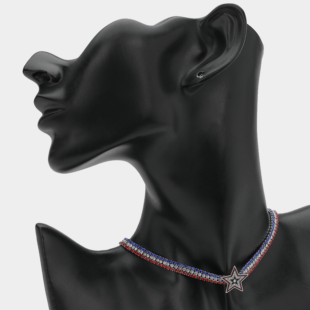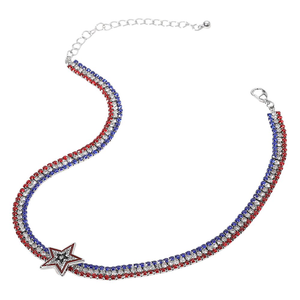 American USA Flag Colored Stone Embellished Star Pointed Choker Necklace