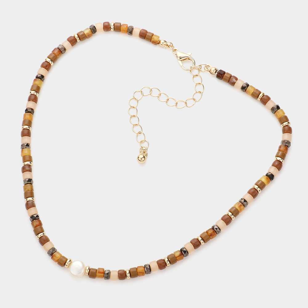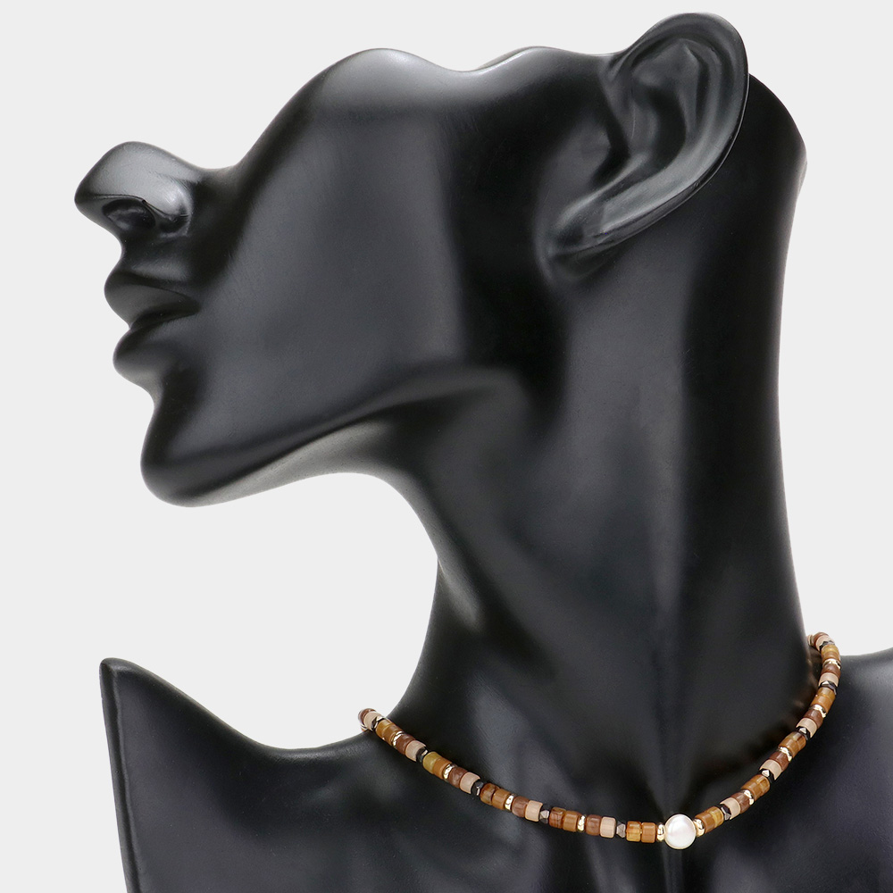 Round Pearl Accented Metal Faceted Beaded Choker Necklace