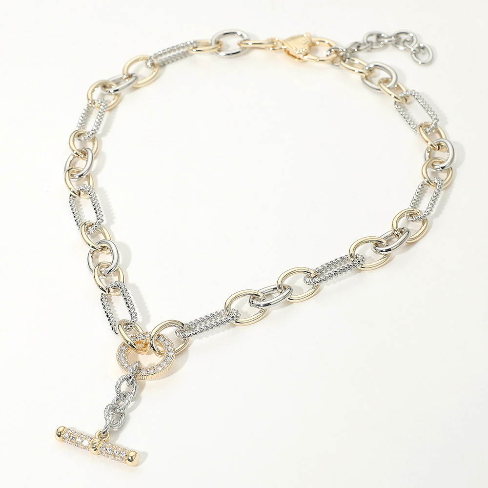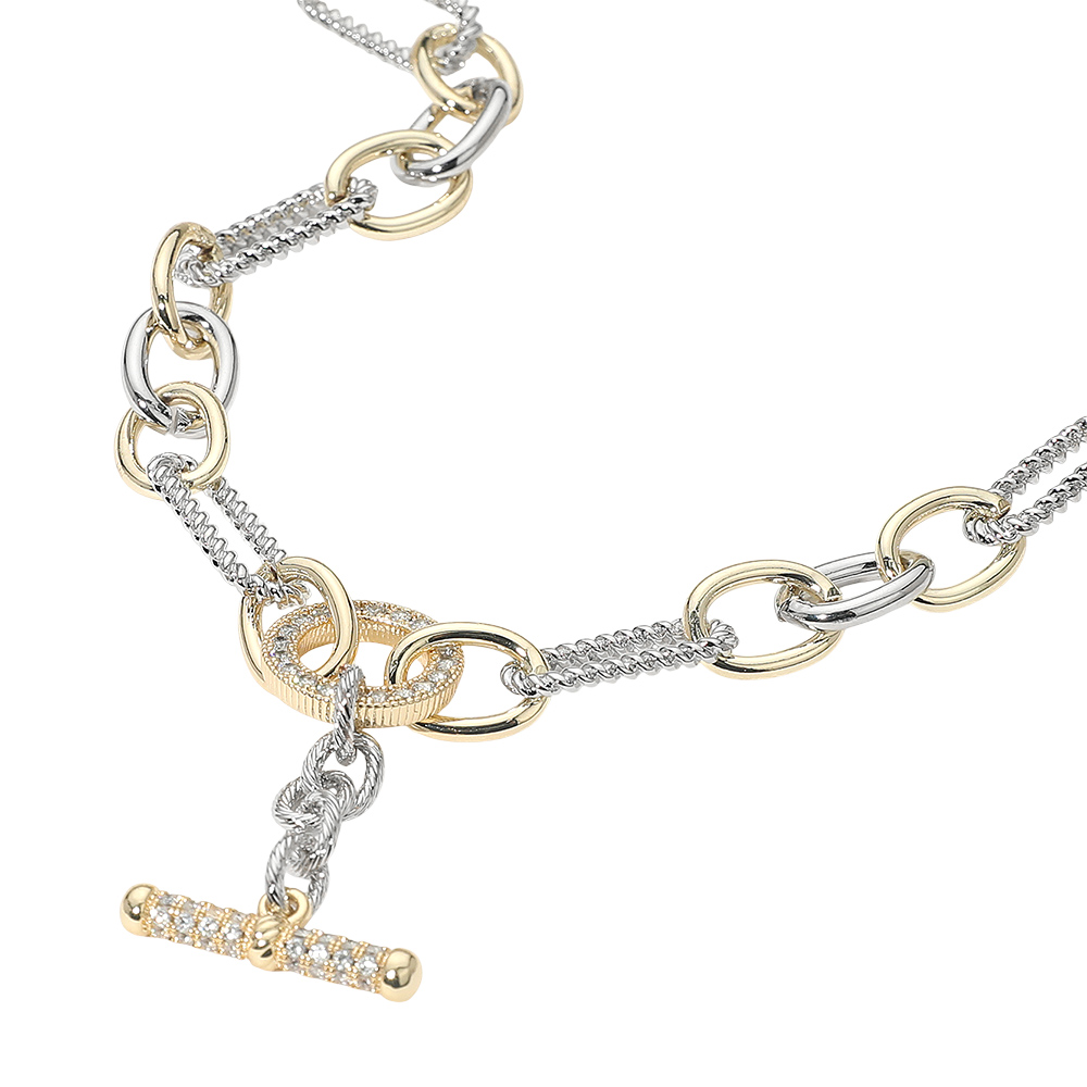Details • Necklace Size : 16.5" + 2" L • Decor Size : 0.4" L • Pendant Size : 1" X 1.75" • Make a bold statement with this chain link necklace featuring mixed textures and a sparkling toggle clasp pendant. Its modern design pairs effortlessly with casual and dressy outfits, offering a chic layered look or standalone elegance. A versatile accessory to elevate your jewelry collection. • CZ Cubic Zirconia • Gold Dipped