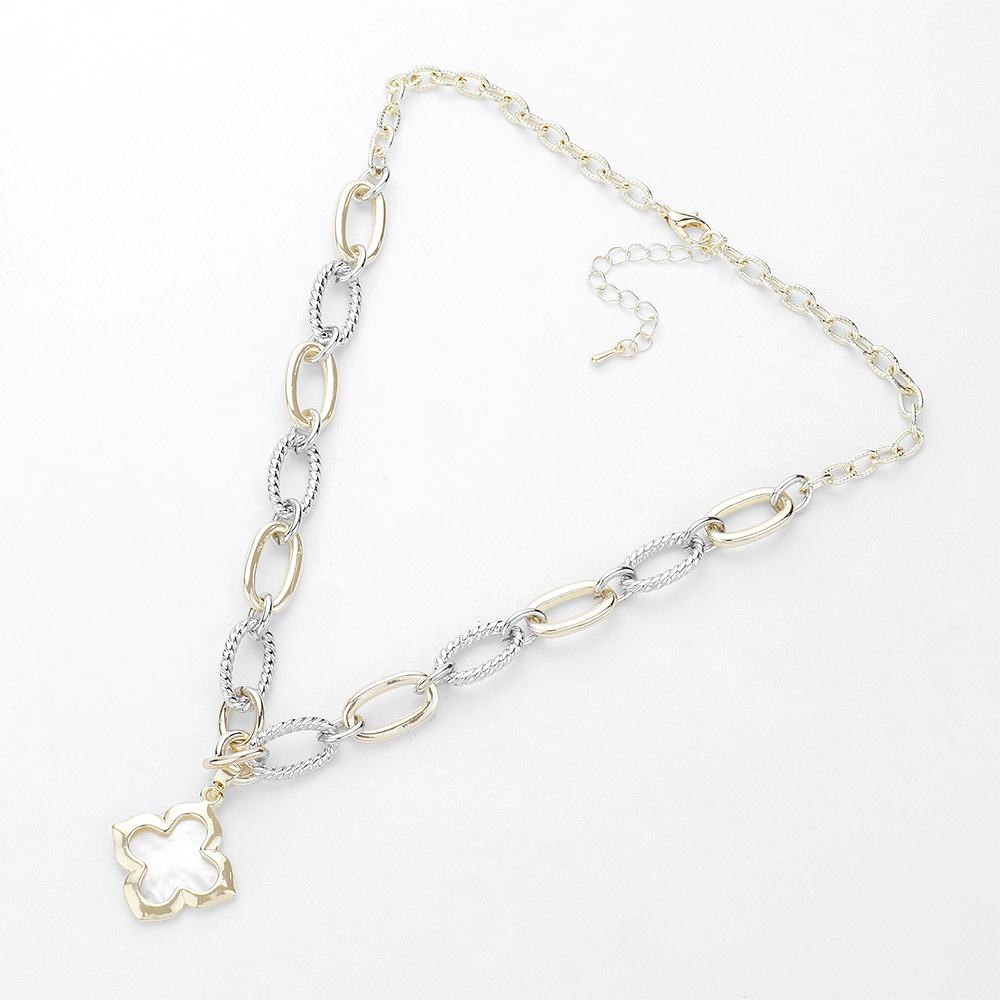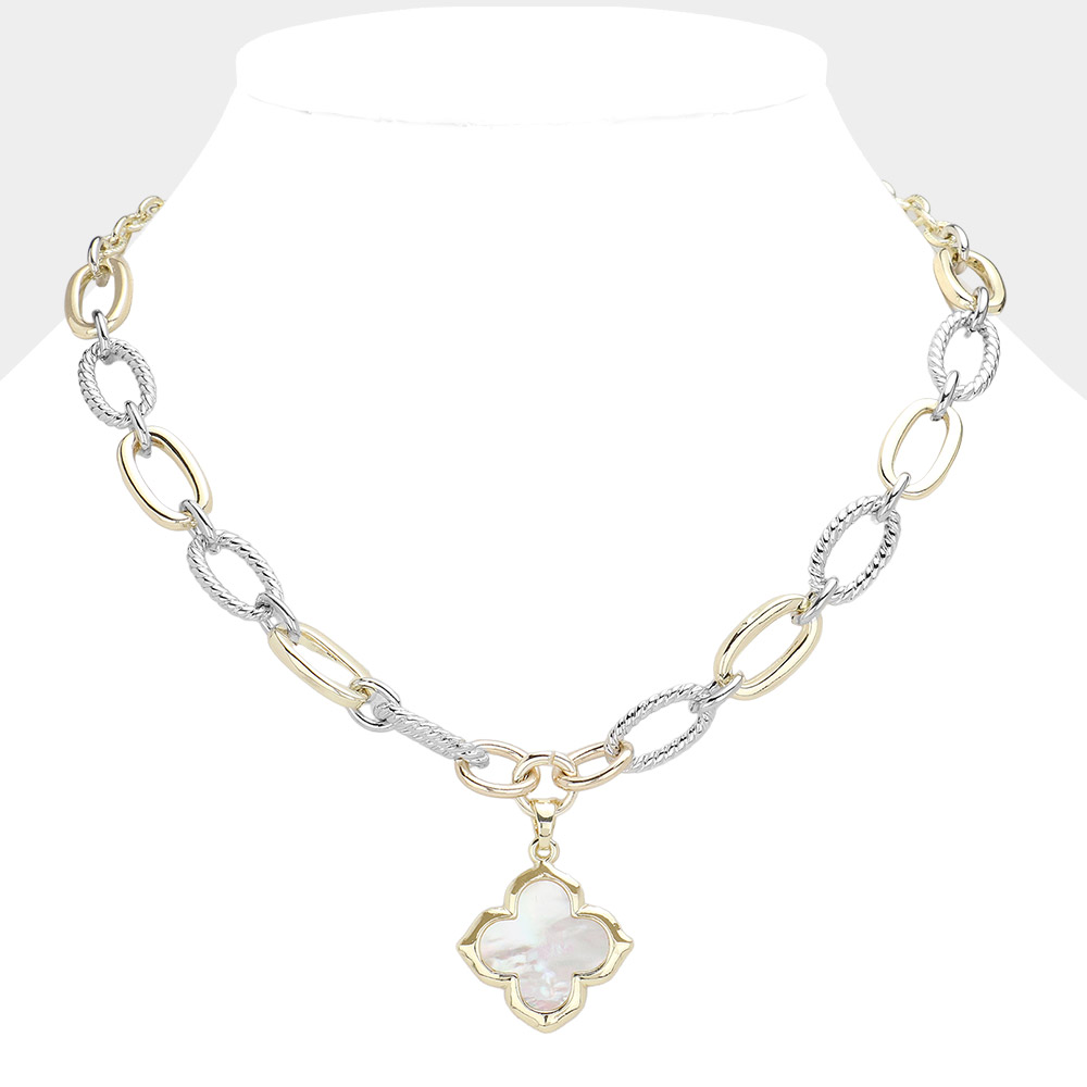 14K Gold Plated Two Tone Mother Of Pearl Quatrefoil Pendant Necklace
