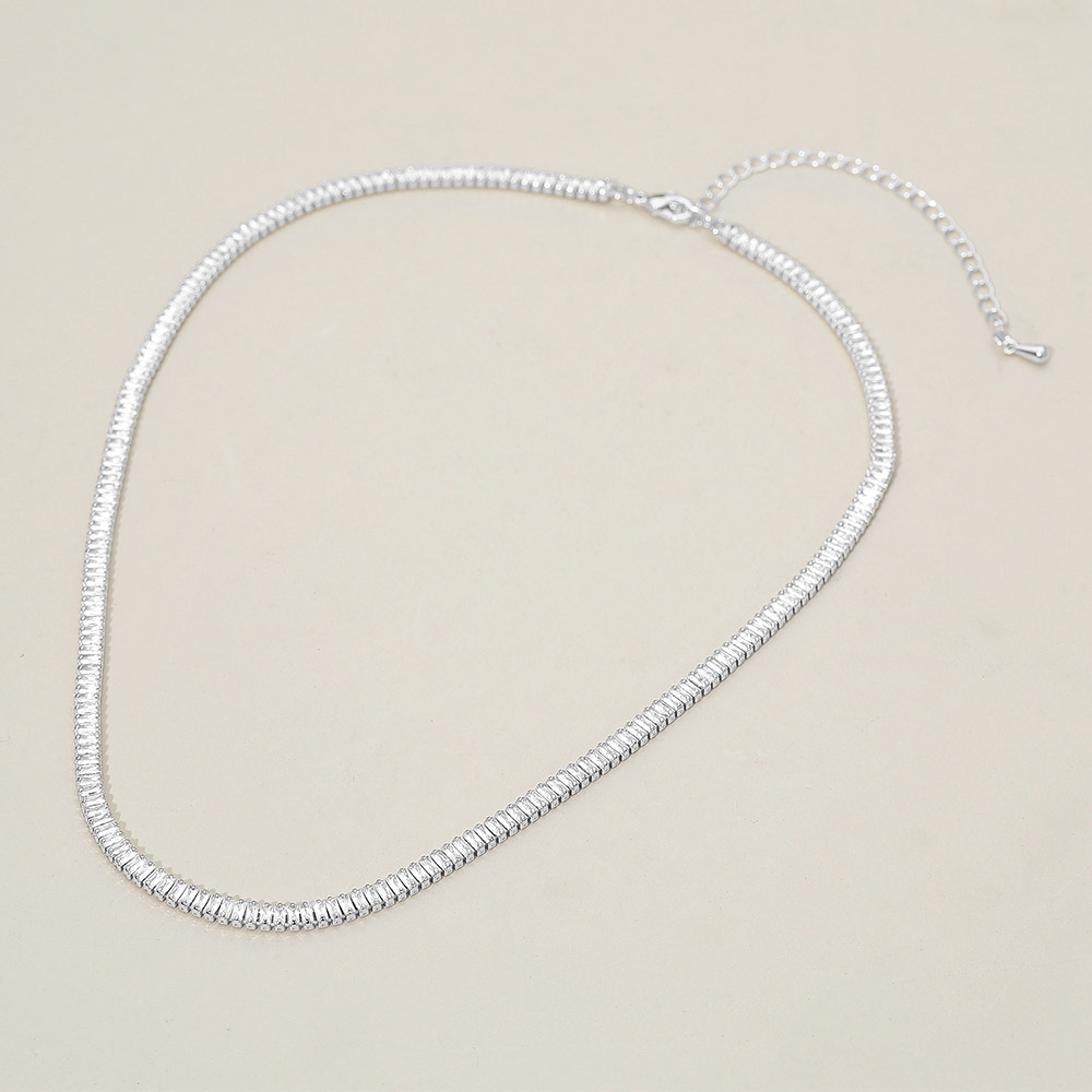 Details • Necklace Size : 16" + 3" L • Decor Size : 0.2" L • Sophisticated tennis necklace featuring sleek baguette-cut crystals for a refined, modern shine. Perfect for formal events or elevating everyday looks, offering timeless beauty and elegance. A luxurious jewelry piece that adds radiant sparkle and style to any outfit effortlessly. • Gold Dipped • Lead and Nickel Compliant