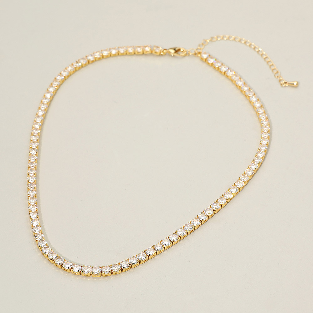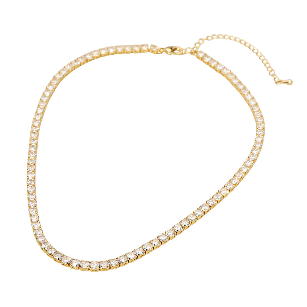 Details • Necklace Size : 16" + 3" L • Decor Size : 0.2" L • Classic tennis necklace featuring a sleek row of radiant round crystals that shimmer beautifully from every angle. Ideal for weddings, parties, or elegant daily wear. A refined jewelry piece that adds sophistication and luminous charm to any look or occasion. • Gold Dipped • Lead and Nickel Compliant