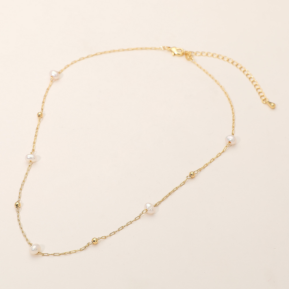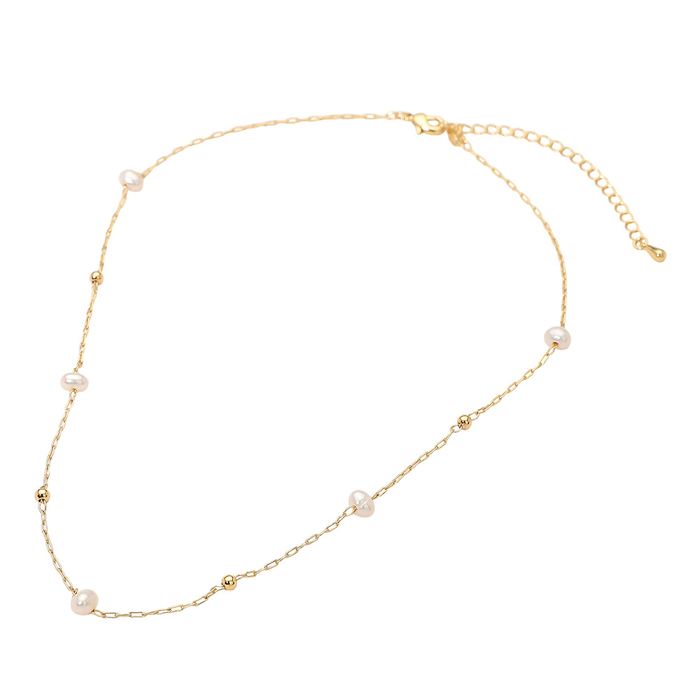 Details • Necklace Size : 16" + 3.5" L • Decor Size : 0.2" L • Elegant minimalist necklace featuring a fine chain adorned with small freshwater pearl and subtle accents for a refined look. Perfect for layering or wearing solo, adding understated sophistication to any outfit. A timeless accessory that complements both casual and formal styles beautifully. • Gold Dipped • Lead and Nickel Compliant