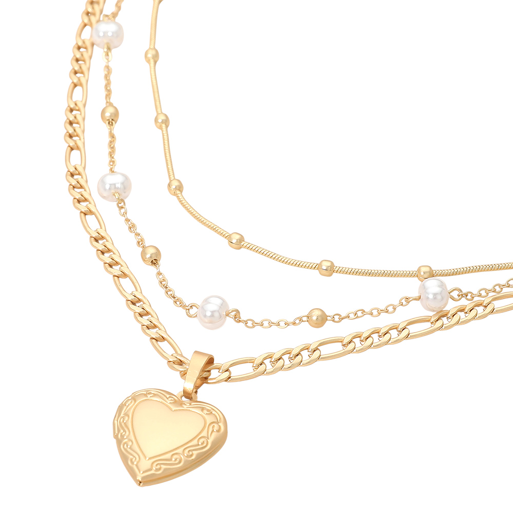 3PCS - Heart Locket Pendant Pearl Station Bead Chain Layered Necklaces