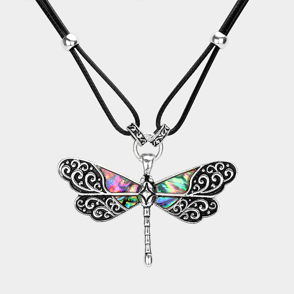 Abalone Embossed Antique Metal Dragonfly Pendant Necklace