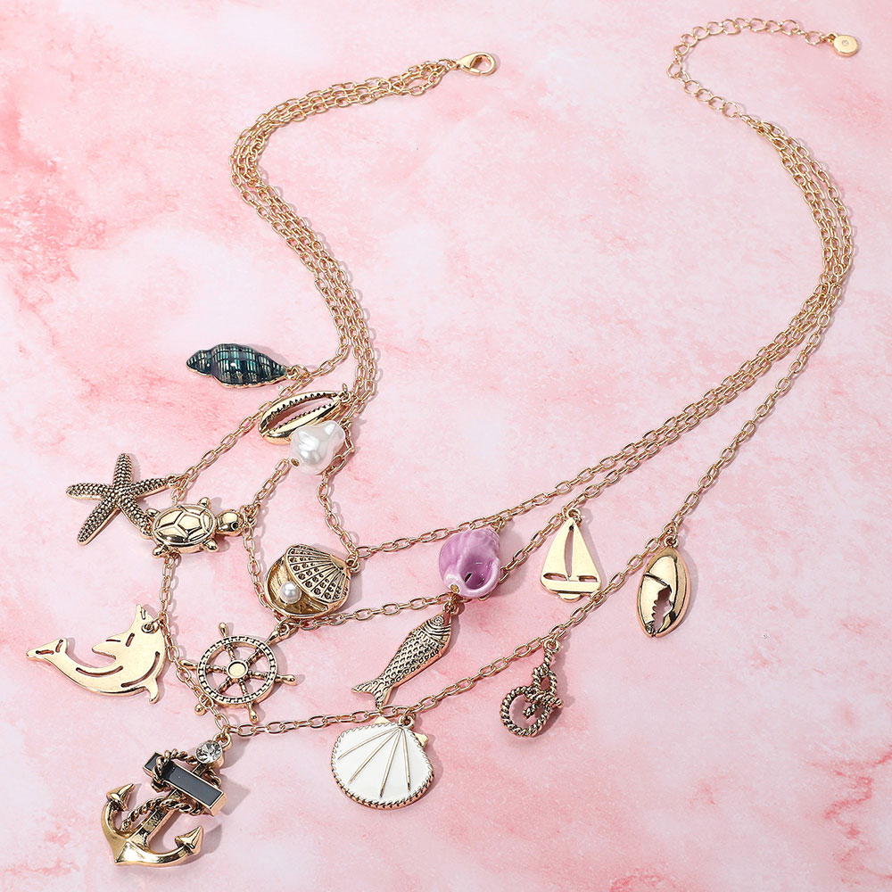 Anchor Sea Shell Pearl Dolphin Fish Rope Sea Turtle Charm Embellished Triple Layered Necklace