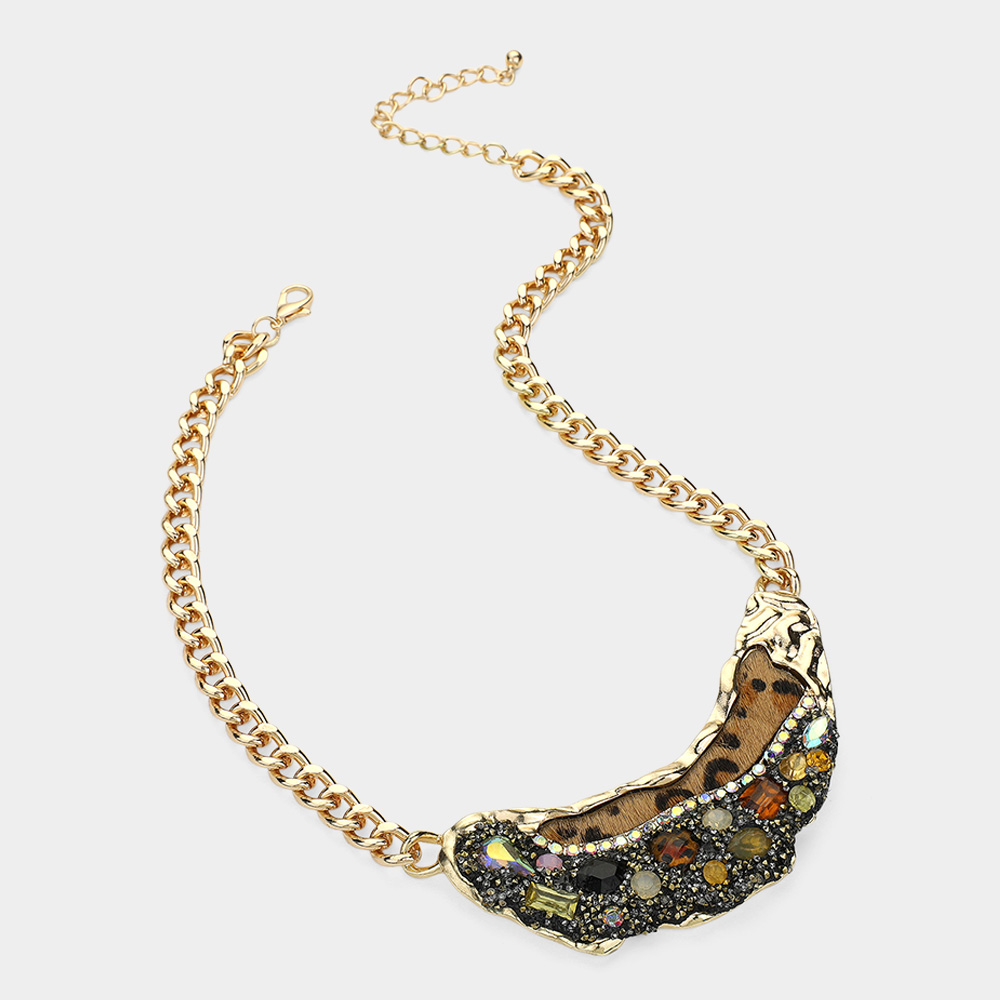 Animal Printed Fur Sparkly Stone Embellished Bib Necklace