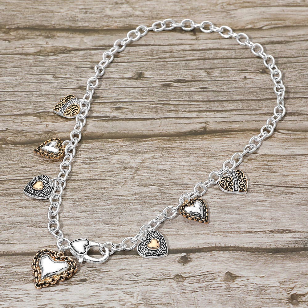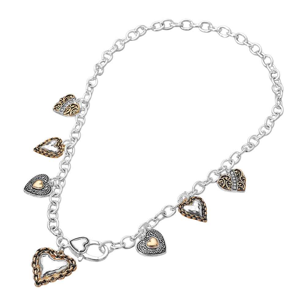 Details • Necklace Size : 18" L • Decor Size : 1.25" L • Add charm to your look with this heart pendant necklace featuring multiple detailed heart charms on a link chain. A romantic accessory perfect for everyday wear or as a thoughtful gift. • Lead and Nickel Compliant